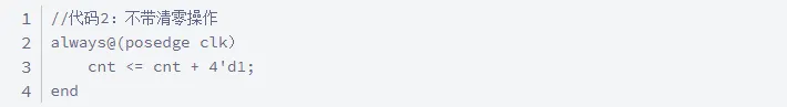 代码2的潜在逻辑是:利用 溢出 完成了原本的清零操作。当cnt为4’d15时,它的加1操作的结果是16即1_0000。因为16的表示需要5bits的位宽,所以它的最高位被截掉了,只剩下了低位的0000,即4’d0。利用了溢出机制的代码2生成的电路是要比代码1生成的电路要小的,因为代码1电路会多一个比较逻辑电路和选择逻辑电路。