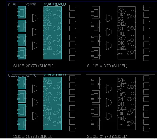 具体使用到的逻辑资源则是编号为CLBLL_L_X2Y79中编号为SLICE_X0Y79中的4个LUT6+1个CARRY4 和 CLBLL_L_X2Y78中编号为SLICE_X0Y78中的4个LUT6+1个CARRY4 。