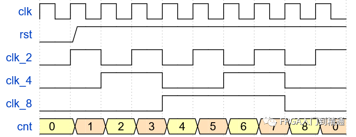 下图分别画出了基准时钟、2分频时钟、4分频时钟、8分频时钟。