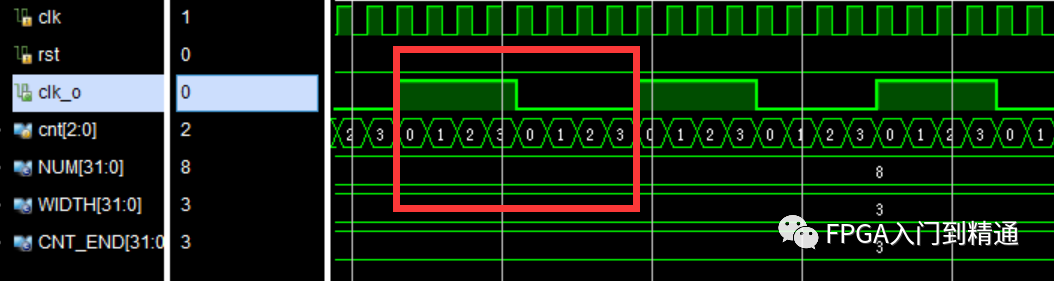 从图中看出,输出了8分频时钟信号,与预期一致。
