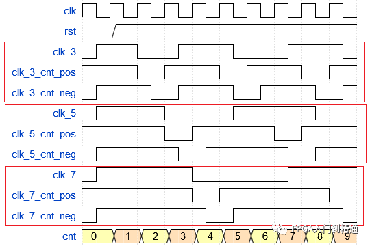 下图分别画出了基准时钟、3分频时钟、5分频时钟、7分频时钟。