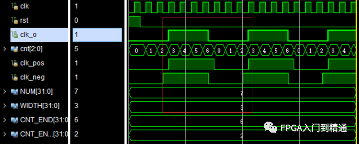 从图中看出,输出了7分频时钟信号,与预期一致。