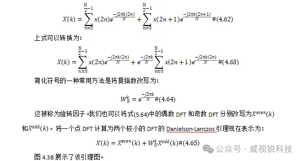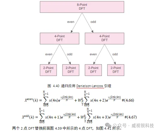 Danielson-Lanczos引理可以推广到8点DFT,如图4.39所示,不需要使用三角函数来计算,而是使用了旋转因子