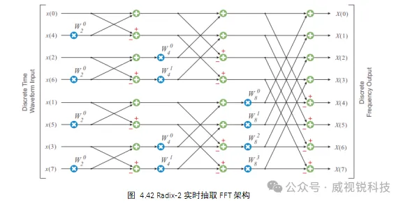 用一个简单的蝴蝶结构来代替2点DFT,8点FFT的最终架构如图4.42所示。
