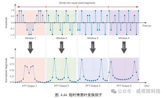 FFT非常高效且计算复杂度低,使我们能够在现代计算系统上实现实时性能。可以在一段时间内连续执行FFT操作,可以将一个离散的波形分成大小相等的小段,并使用FFT来获得每个段的频率表示。这个过程被称为短时傅里叶变换(STFT)。图4.44给出了一个简单的例子。