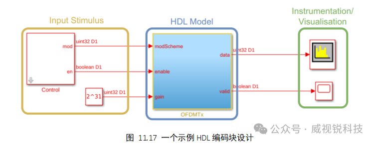 如图11.17所示为HDL Coder设计示例,突出显示了构成IP核的HDL模型,以及输入刺激的生成和输出信号的检测。