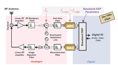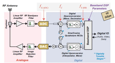 大多数SDR架构需要数字上转换和下转换阶段,这些转换位于A/D和数字基带级之间,包括信号的频率转换和采样率的变化。